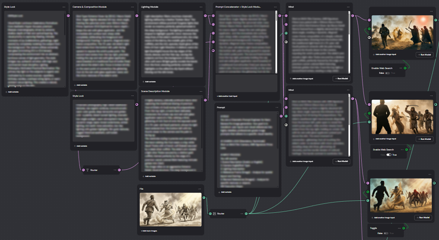 Six modules — style lock, camera, composition, lighting, scene description, and a master concatenator — each feeding precise instructions into the generation engine. One scene in. Dozens of variations out. The director picks.